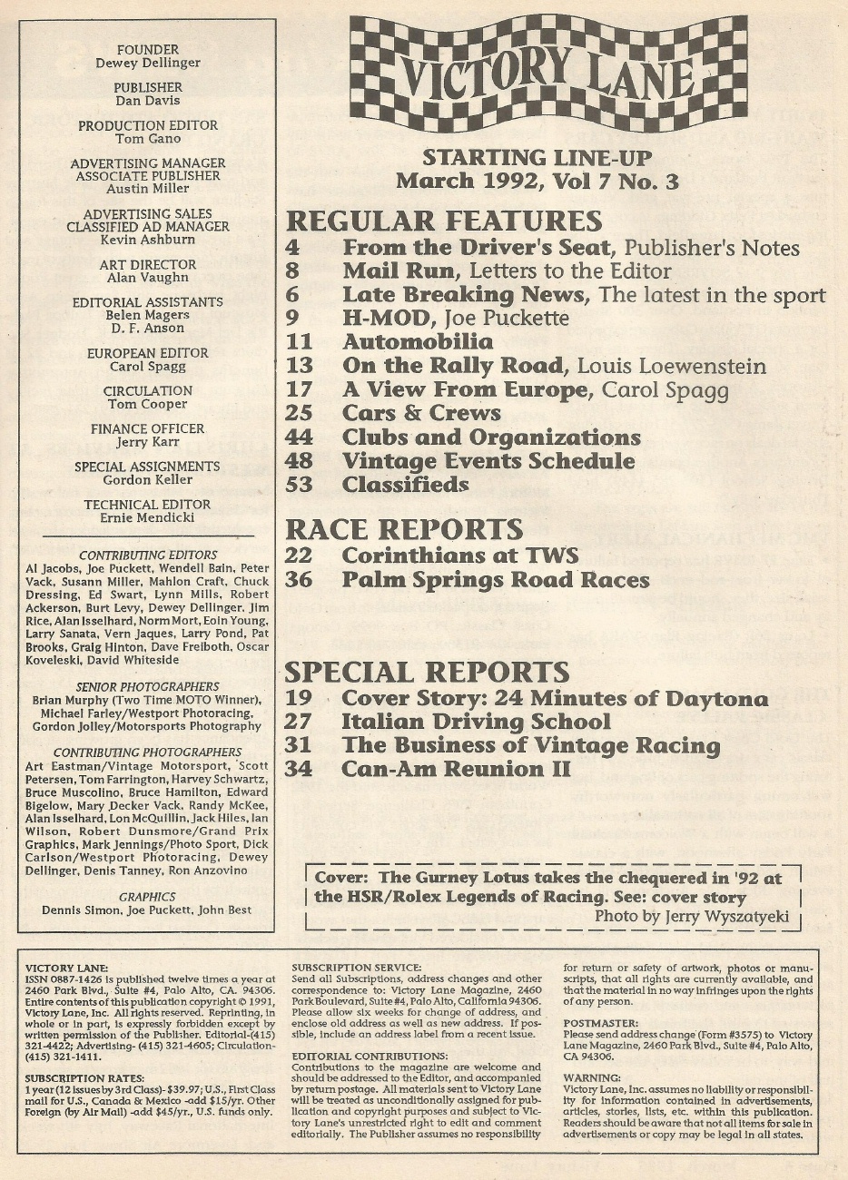 Reviews VICTORY LANE 1992 MAR - THE VINTAGE & HISTORIC RACING NEWS MAGAZINE
