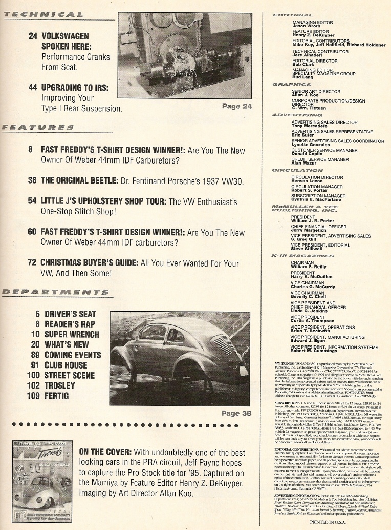Reviews VW TRENDS 1995 DEC - '37 PORSCHE VW30, SWEET ’64 NOTCH, ’69 TYPE 3 DROPTOP*