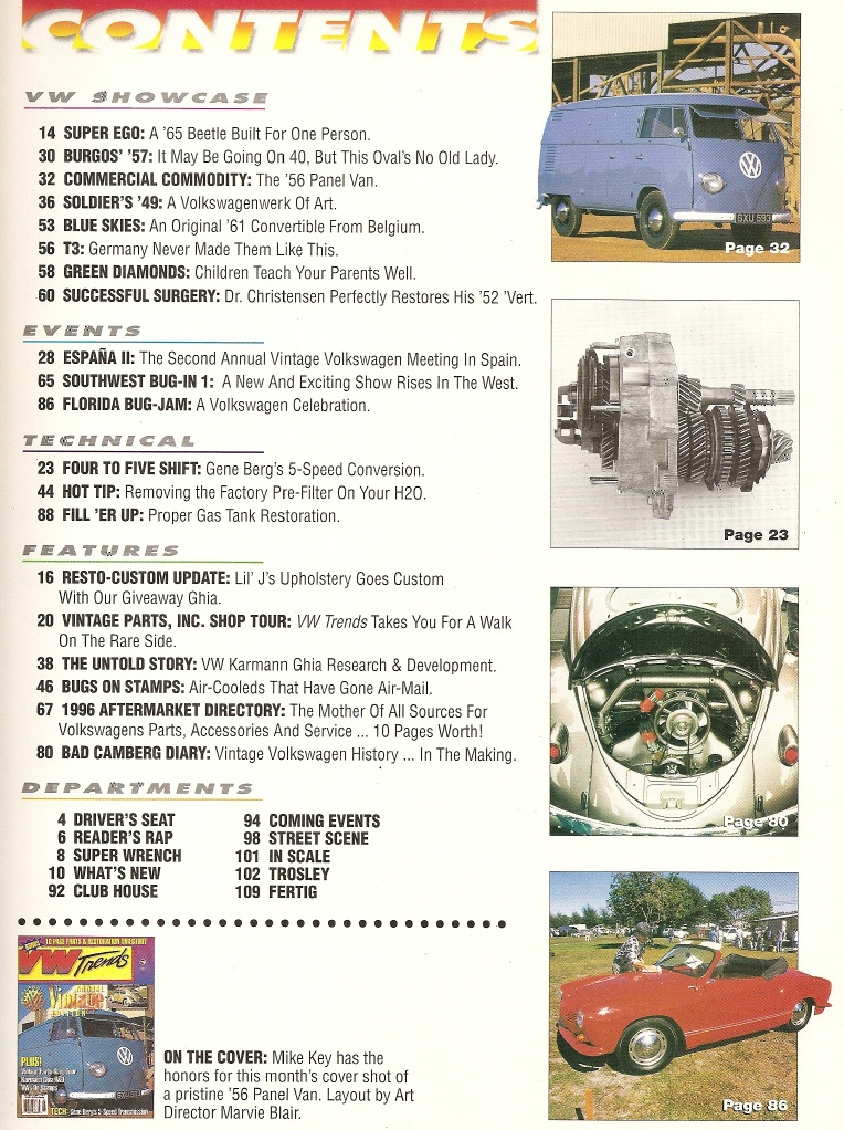 Reviews VW TRENDS 1996 MAY - SUPER ’56 PANEL VAN, SWEET ’49 BUG, 4 TO 5 SPEED