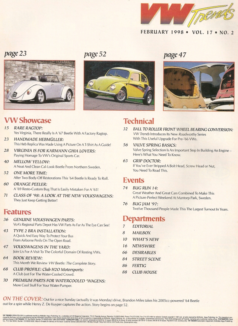 Reviews VW TRENDS 1998 FEB - RARE ’67 SUNROOF BUG, BALL TO ROLLER WHEEL BEARINGS