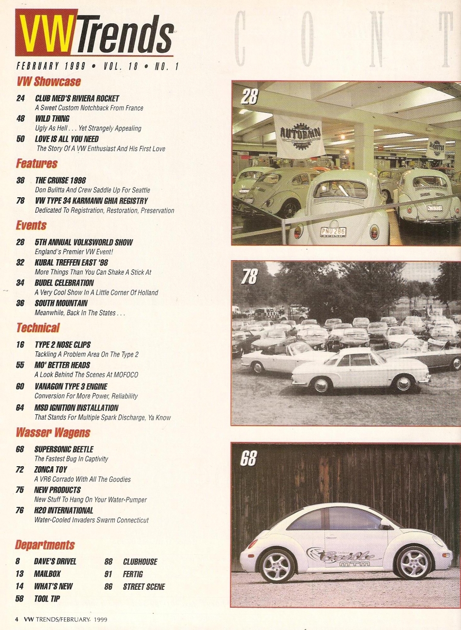 Reviews VW TRENDS 1999 FEB - TYPE 24 KARMANN GHIA, TYPE 2 NOSE CLIP REPLACED, HOT SLC